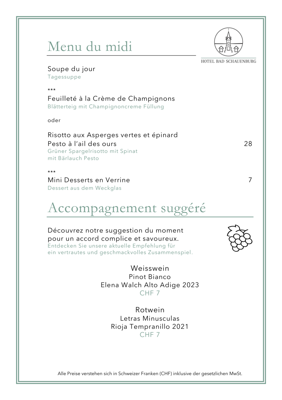 Im Hauptgebäude werden Sie über den Mittag in der Brasserie Bad Schauenburg (Klassische Französische Küche) verwöhnt und im Economiegebäude befindet sich das urchige Bistro Zum Schauenegg (authentische regionale Landküche). Beachten Sie auf unserer Website die Öffnungszeiten der beiden Lokale.
